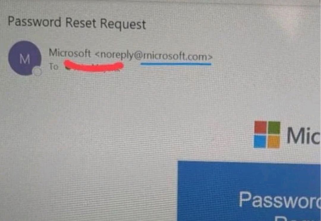 Impariamo qualcosa e stiamo attenti. Questa e-mail è un falso ben camuffato. Osserva con molta attenzione. Il dominio non è microsoft.com, ma rnicrosoft.com — cambia…
